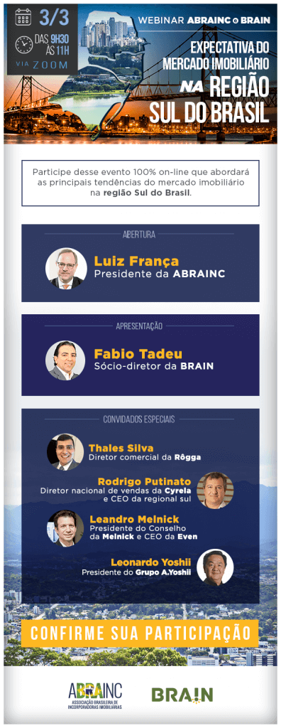A Abrainc e a Brain - Inteligência Estratégica promovem na próxima quarta-feira (03/03) o webinar "Expectativas do Mercado Imobiliário na Região Sul do Brasil".