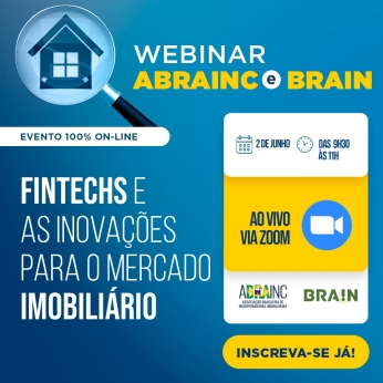 A ABRAINC e a Brain promovem no próximo dia 2 de junho o webinar "Fintechs e as inovações para o mercado imobiliário". O evento será realizado a partir das 9h30, de forma 100% on-line, com transmissão via Zoom e Youtube.