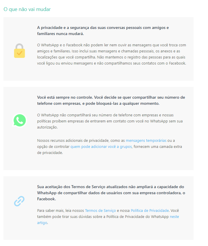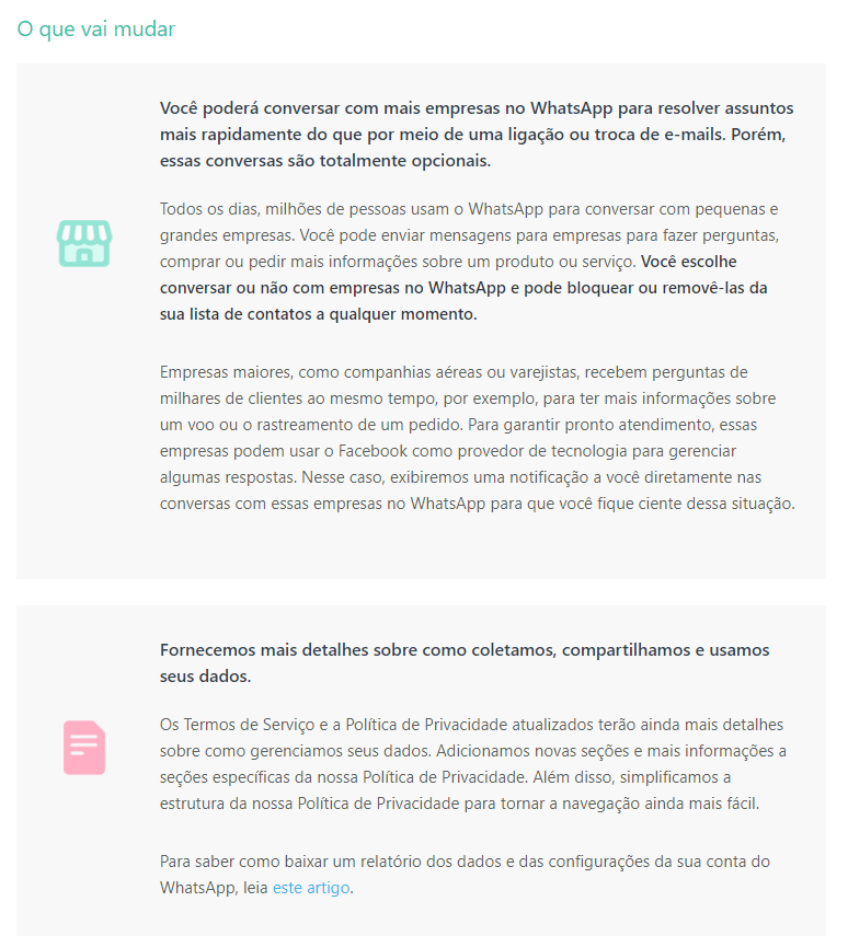 As mudanças nos Termos de Serviço e na Política de Privacidade são relacionadas a conversas entre empresas e clientes no WhatsApp, e fornecem mais informações sobre como são coletados, compartilhados e utilizados os dados.