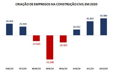 Segundo dados do CAGED divulgados pelo Ministério da Economia nesta quarta (30/09), a Construção Civil criou 50 mil vagas em agosto e acumula saldo positivo de 109 mil vagas nos últimos 3 meses.