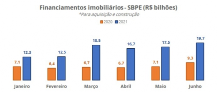 Foram financiados em junho de 2021, nas modalidades de aquisição e construção, 86,2 mil imóveis, resultado 17,8% superior ao de maio. Comparado a junho de 2020, a alta atingiu 160%.
