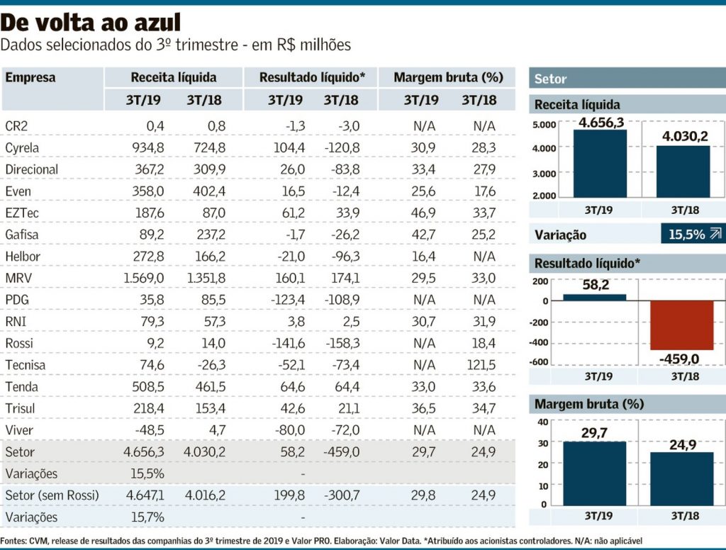 De julho a setembro, o setor teve lucro líquido de R$ 58,2 milhões, revertendo a perda de R$ 459 milhões do mesmo período de 2018. Realizado pelo Valor Data, o levantamento inclui dados da CR2, Cyrela, Direcional Engenharia, Even Construtora e Incorporadora, EZTec, Gafisa, Helbor, MRV Engenharia, PDG Realty, RNI Negócios Imobiliários, Rossi Residencial, Tecnisa, Tenda, Trisul e Viver Incorporadora.