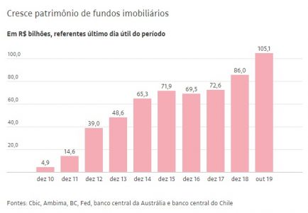 Segundo dados da Anbima (Associação Brasileira das Entidades dos Mercados Financeiro e de Capitais), os fundos imobiliários tinham R$ 105 bilhões em patrimônio líquido em outubro de 2019. É o maior valor no levantamento histórico feito pela entidade.