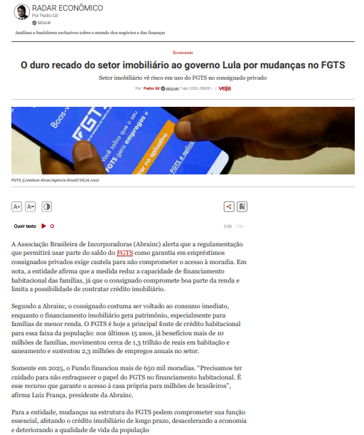 A ABRAINC (Associação Brasileira de Incorporadoras) avalia que a regulamentação que permitirá o uso de parte do saldo do FGTS como garantia no novo consignado privado exige cautela para não Categoria: